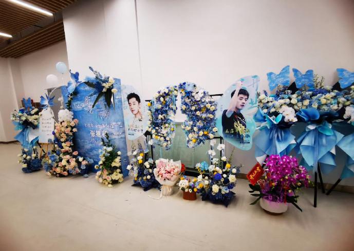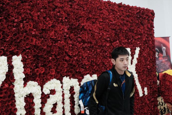 张继科粉丝们提前预定摆放的玫瑰花墙,上面写着他的名字拼音:Zhang JK