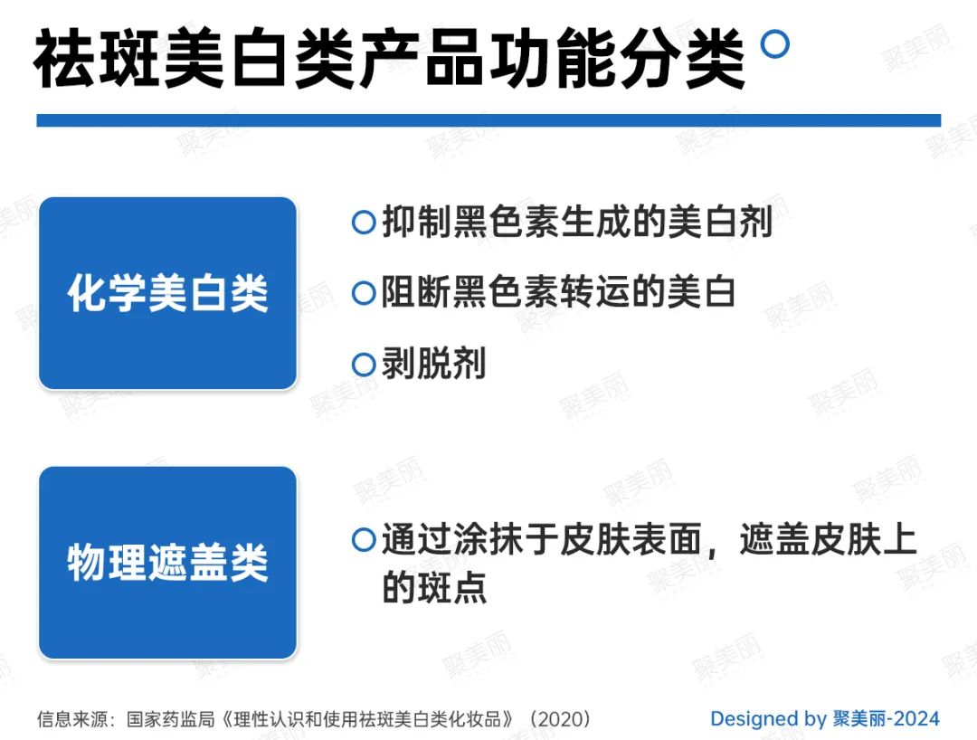 目前,祛斑美白类成分功效主要可分为化学美白和物理遮盖两类。化学美白的作用机理主要包括:抑制黑色素的生成,阻断黑色素的转运,还原黑色素,促进表皮黑色素的脱落等。