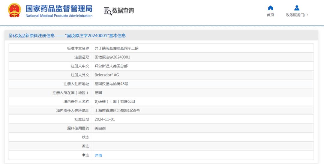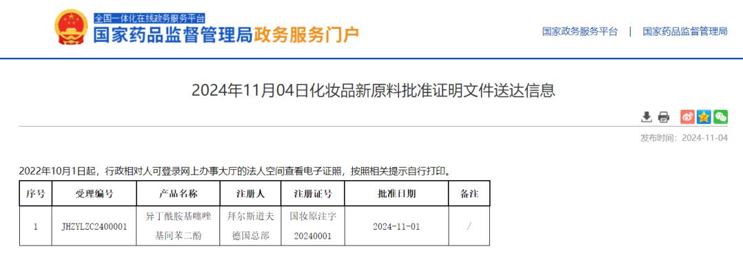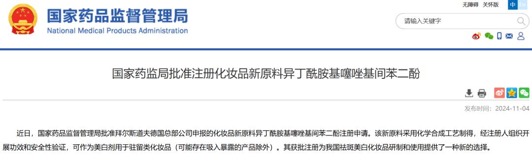 11月4日,国家药品监督管理局(以下简称:国家药监局)相关信息显示,拜尔斯道夫德国总部公司申报的化妆品新原料异丁酰胺基噻唑基间苯二酚(肽安密多Thiamidol下称:630),于2024年11月1日,获得国家药品监督管理局批准注册。