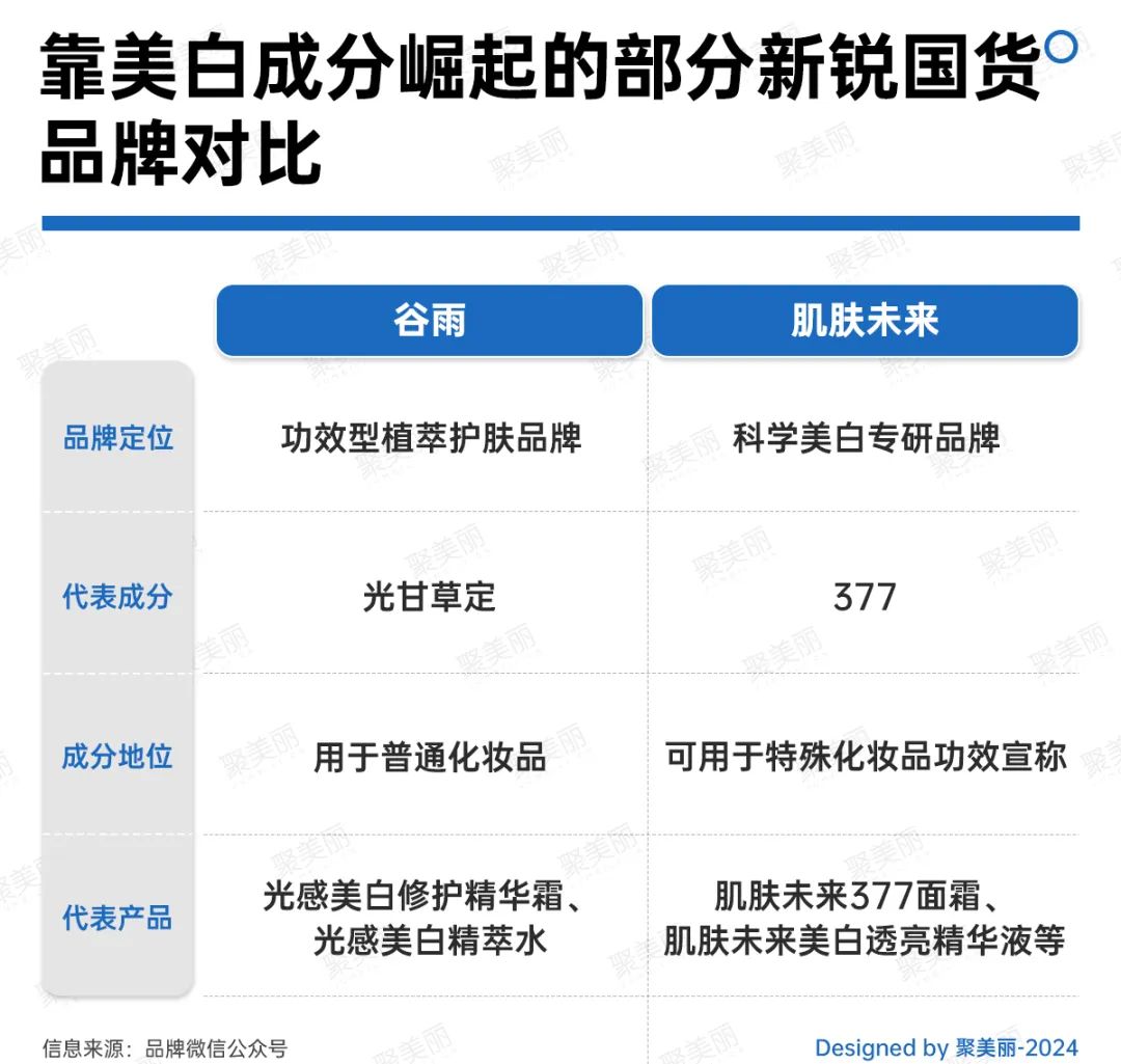 一直以来,虽然美白原料注册艰难,但也有国内化妆品公司都在发力美白化妆品,从这一赛道跑出来,比如专研光甘草定植萃护肤的谷雨和专研科技美白377成分的肌肤未来。