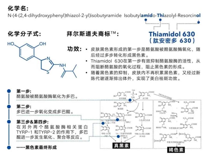 据拜尔斯道夫微信公众号显示,皮肤黑色素形成的第一步就是酪氨酸被酪氨酸酶氧化,随后经过多步转化形成黑色素。630则是在第一步有效抑制酪氨酸酶的活性,从而阻断酪氨酸的氧化过程,阻止黑色素的形成。