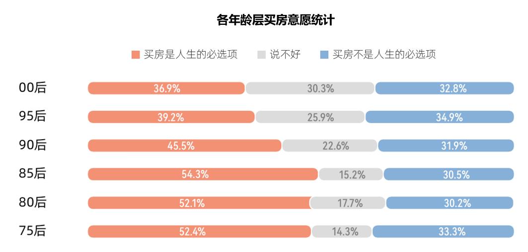 根据DT研究院的《2024年年轻人买房意愿调查报告》显示,只有不超过4成的95-00后认为买房是一种必要选项