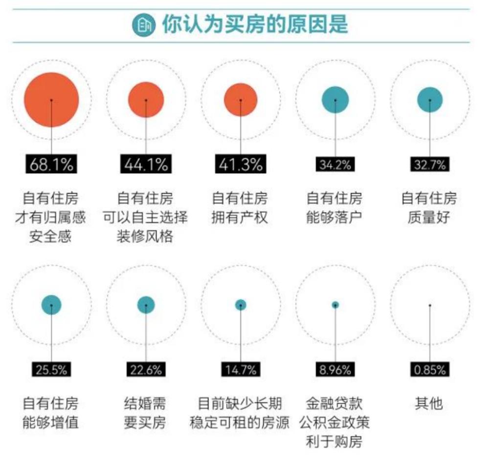 另外有买房意愿的年轻人比例几乎和不买房的相当,可见,“非刚性置业“俨然成为年轻一代的购房标签。