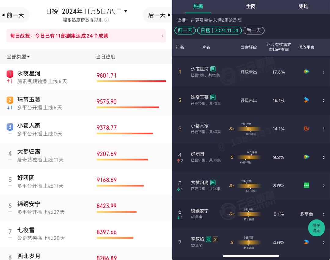 事实上,从数据上看,《永夜星河》《珠帘玉幕》在热度方面不相上下。 猫眼数据显示,《珠帘玉幕》开播的前五天里,有四天热度超过《永夜星河》;11月4日的云合数据则显示,《永夜星河》的正片有效播放市场占有率超过《珠帘玉幕》,前者为17.3%,后者为15.1%。无论猫眼热度还是占有率,两者数值相差并不大。