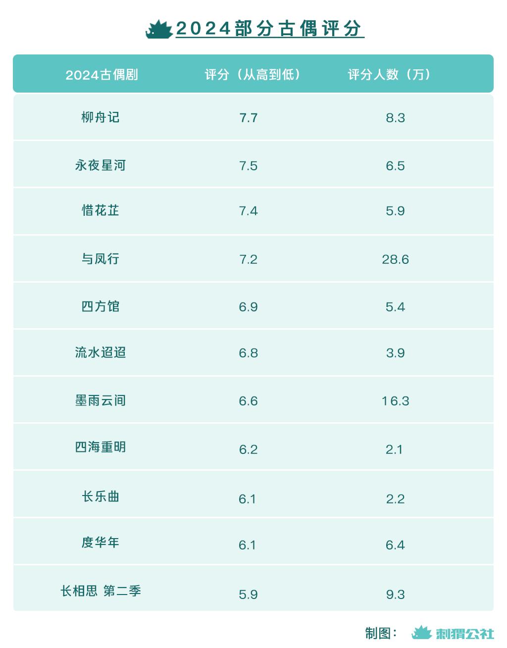 刺猬公社统计了2024年播出的24部古偶剧发现,只有10部剧集豆瓣评分在6分之上,再看评分人数,只有《与凤行》《墨雨云间》《狐妖小红娘·月红篇》的评分人数在10万以上。