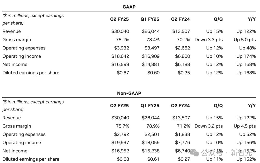 财报显示,Q2季度,英伟达营收达300亿美元,远超市场预期的287亿美元,同比增长122%,在GAAP规则下,净利润同比大增一倍多,至166亿美元,合每股收益为0.67美元,均超过分析师预期。