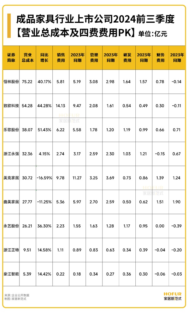 9家上市公司中,营业总成本的花费情况基本与营收规模成正比,比如营收最高的前三家上市公司恒林股份、致欧科技和乐歌股份,他们耗费的成本也最高,分别以75.22亿元、54.28亿元、38.07亿元排名前列,并且均以超过40%的幅度在同比增长,其中乐歌股份更是以51.43%的成本增速居于第一。