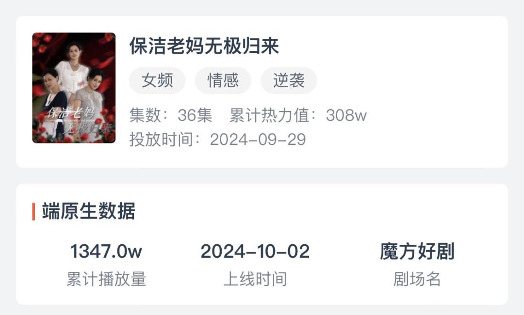 像《保洁老妈无极归来》这样的剧,具有很强的话题属性,在初始设定下就会引发争议。但不落地,悬浮和猎奇的剧情很难击穿中老年短剧的真正受众,仅308万的充值意味着其市场反馈并不好。