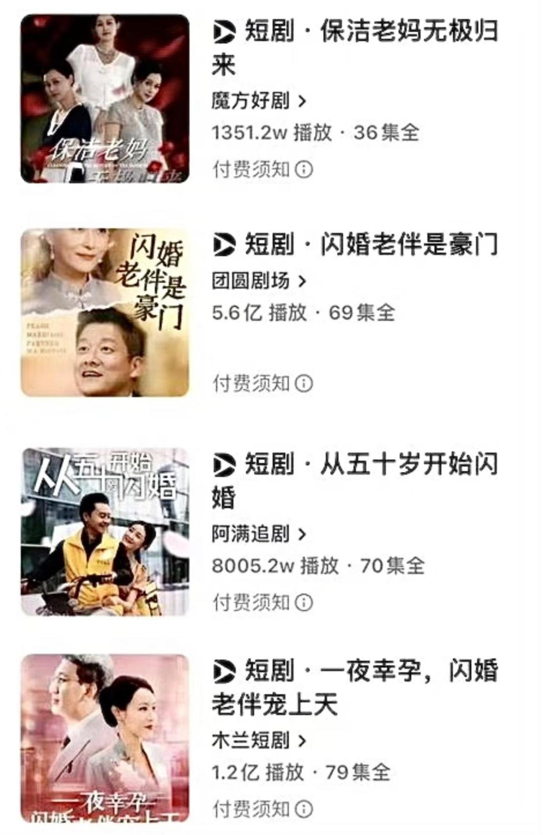 在麦芽短剧的《我是妈妈》《妈妈别哭》、友合的《母爱无声》爆了之后,市面上出现了一大批同类型,甚至剧情也都雷同的短剧。《闪婚50岁》《闪婚老伴是豪门》火了之后,前缀为闪婚的中老年短剧成为一时大热,但都无法再重现爆款。