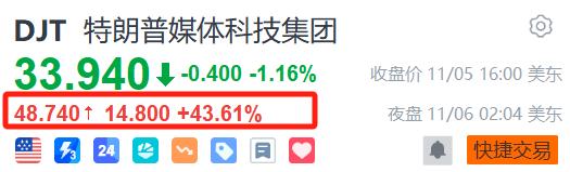 概念股方面,虽然特朗普媒体科技集团(DJT)尾盘跌了,但到了夜盘阶段,随着点票工作开始,共和党的传统票仓开始显示出利好特朗普的结果,DJT直接一路狂涨,攻破20个点、30个点,午后(北京时间)随着特朗普领先优势扩大,DJT涨幅直接飙到43%,并触发熔断而暂停交易。