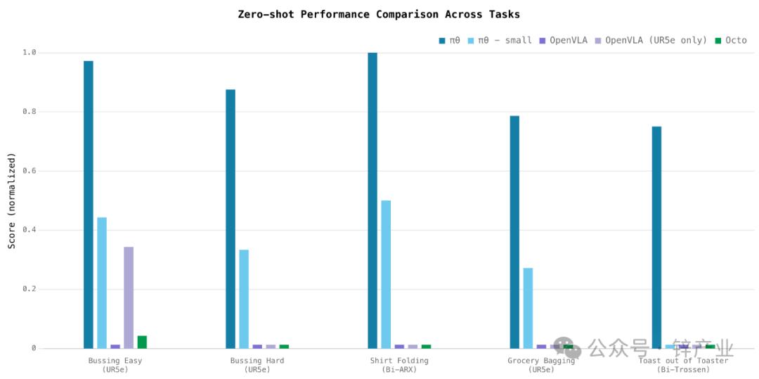 PI团队就单一指令简单任务、复合指令复杂任务,以及叠衬衫、杂物装袋、从烤面包机中拿出吐司几个任务,对π0、π0-small(未使用VLM预训练的470M参数模型)与OpenVLA、Octo进行了对比,得出的结论是,π0实现了全面碾压。