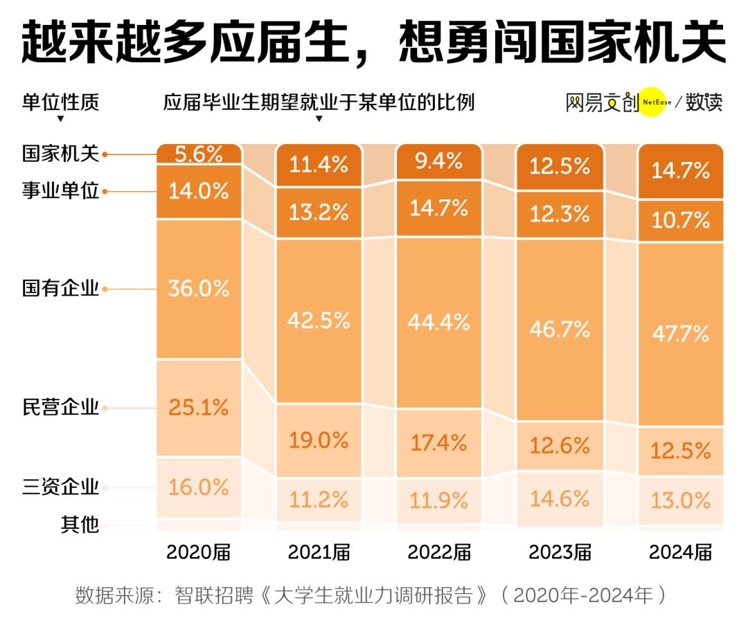 在 2020 届,希望就职于国家机关的毕业生还只占 5.6%,吸引力甚至不敌民营企业,到了 2024 届这一比例就跃升至 14.7%,成为了毕业生心目中仅次于国有企业的第二热门选择。