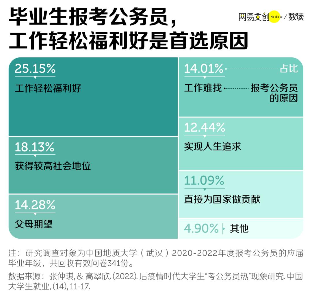 一项针对中国地质大学报考公务员的毕业生调查显示,25.15% 的大学生选择报考公务员是因为觉得工作轻松福利好 [6],其次是能获得较高的社会地位。