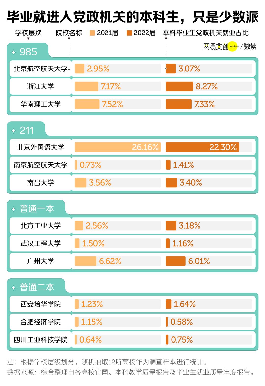 应届生争抢的上岸,更像是不切实际的奢望,我们根据学校层级随机抽取了 12 所高校,发现本科毕业就能直接就职于党政机关的,只有少数佼佼者。