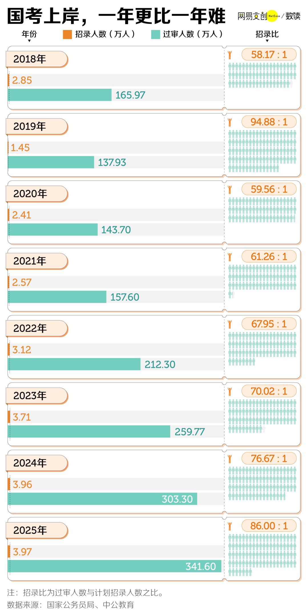 在 2025 国考,共有 341.6 万考生通过资格审核,平均招录比为 86:1,最终只会有 3.97 万个幸运儿上岸。