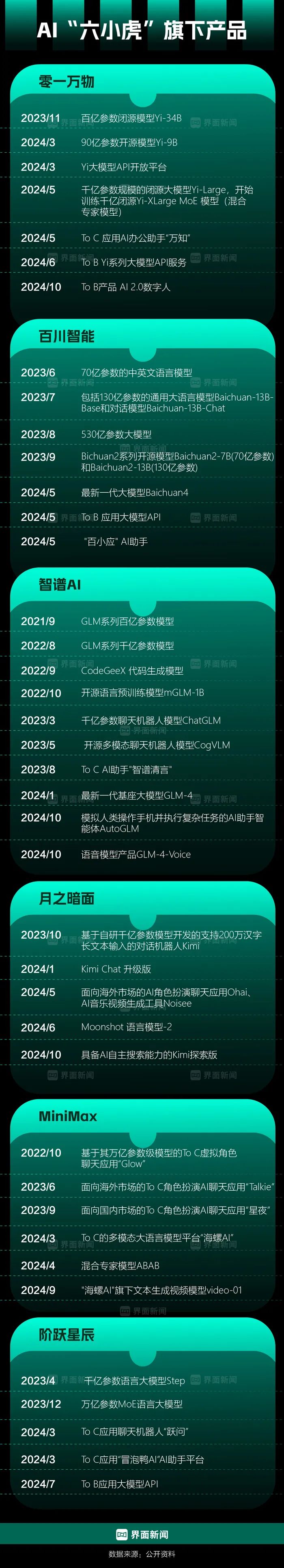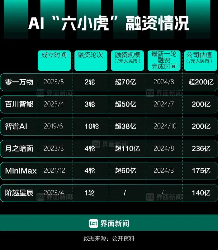 智谱AI、百川智能、月之暗面、Minimax、零一万物、阶跃星辰这六家中国大模型初创公司,被业界冠以“六小虎”之称。过去一段时间,他们都拿到了数十亿乃至百亿人民币级别的融资,都在烧钱抢算力、抢人才,希望成为中国的“OpenAI”。