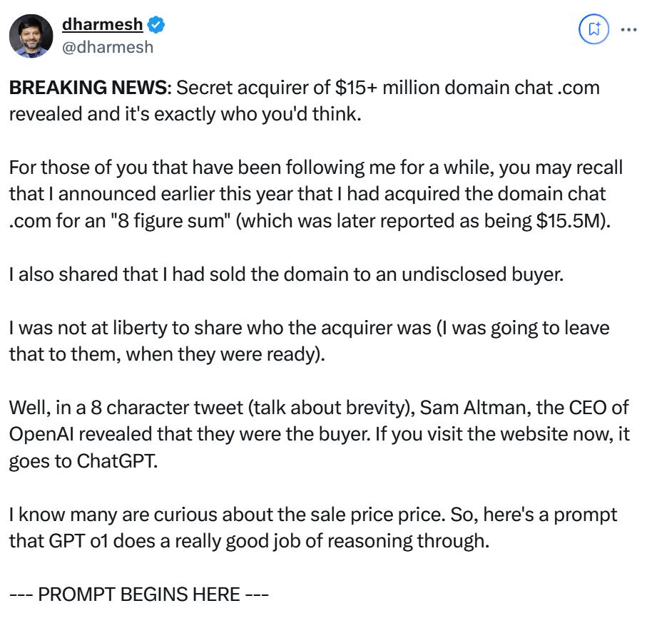 - OpenAI 是这个域名的完美归宿,所以他决定出售