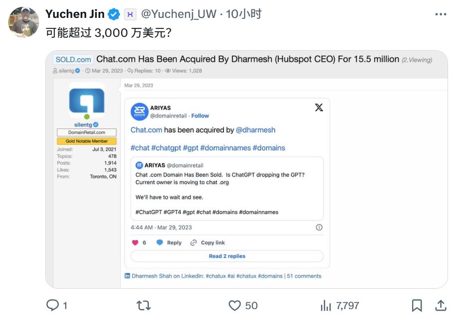 很快就有人查到,chat.com 这个域名上次的交易额就高达一千多万美元。这下大家的兴趣都被勾了起来:这次 Sam Altman 又砸了多少钱进行收购呢?