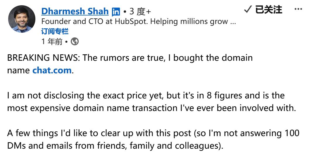 - Dharmesh 以 1550 万美元购买了 chat.com