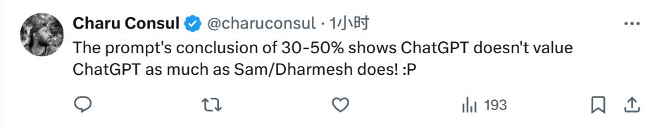 Shah 提到了是“部分股权”之后,又有人开始猜到底是多少股权,比如有人往 ChatGPT 那塞了 Shah 给出的提示词,结果 ChatGPT 给出了 30%-50% 股份的答案:“这表明 ChatGPT 并不像 Sam/Dharmesh 那样重视自己!”