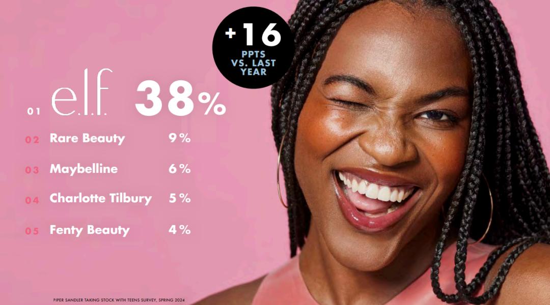 在退出中国市场的首个财年电话交流会上,e.l.f. Beauty表示,根据PIPER Sandler公司在2024年春季对青少年的一项调查显示,e.l.f.受欢迎程度超越了Rare Beauty、美宝莲、Fenty Beauty等一众知名彩妆品牌。