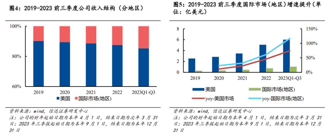 回到e.l.f. Beauty来讲,据信达证券此前的研究情况来看,近年来美国市场为e.l.f. Beauty贡献了绝大部分业绩,且保持着不错的增速。国际市场虽然增速高于美国市场,但从收入结构来看,美国地区仍占大头。