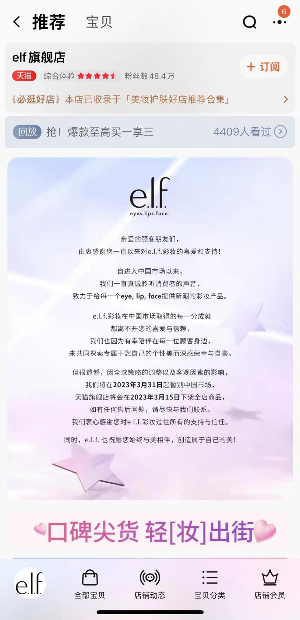 值得注意的是,e.l.f. Beauty此前宣布于2023年3月31日起退出中国市场,对于退场原因,e.l.f. Beauty表示系因全球策略调整以及客观因素的影响。