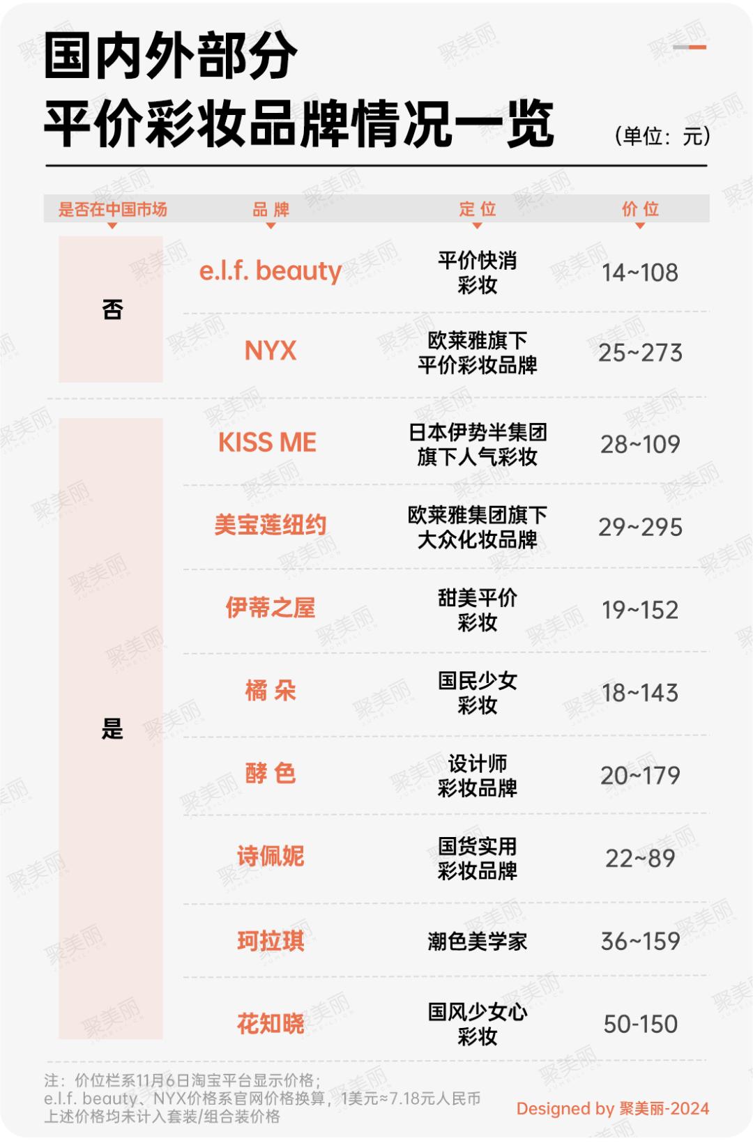 为此,聚美丽统计了国内外部分平价彩妆品牌相关情况。