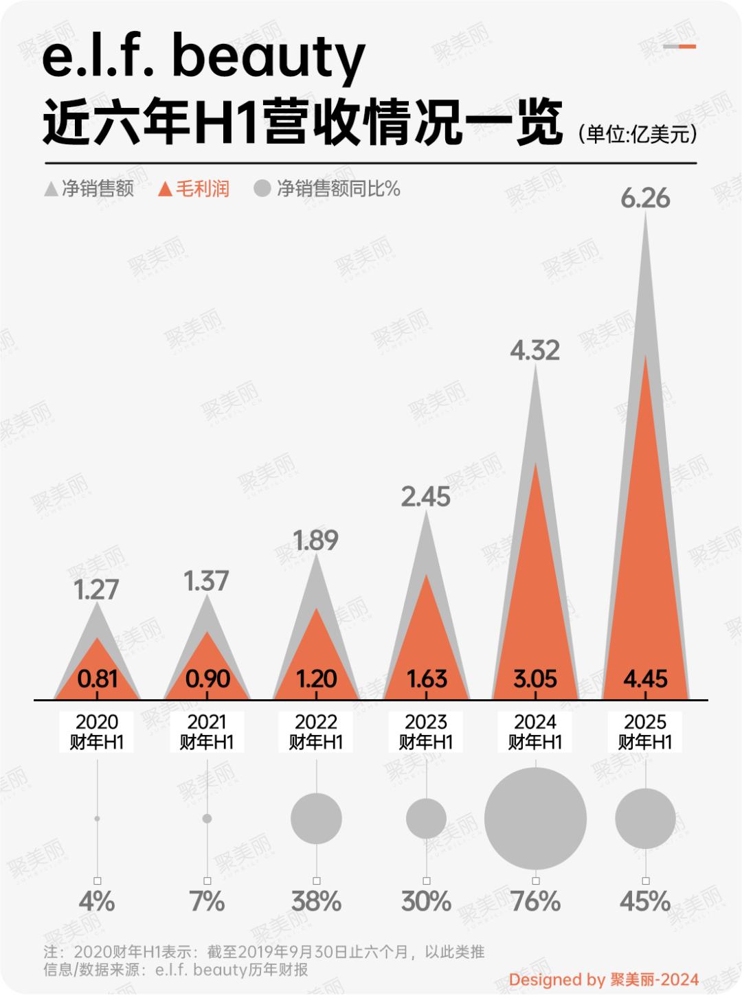 从2025财年(2024年3月31日-9月30日)整体数据来看,e.l.f. Beauty六个月共计净销售额为6.26亿美元(约合人民币44.97亿元),较2024财年同期的4.32亿美元(约合人民币31.03亿元),同比增长45%,毛利润为4.45亿美元(约合人民币31.96亿元),毛利率为71%。