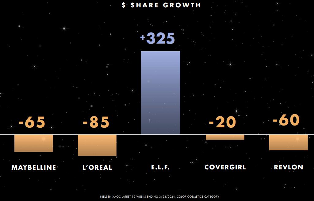2024财年,e.l.f. 在美国彩妆市场的份额增长了325个基点至10.5%,成为第二大彩妆品牌。其他主要彩妆品牌,如美宝莲、Covergirl、Revlon等的市场份额都出现了负增长。