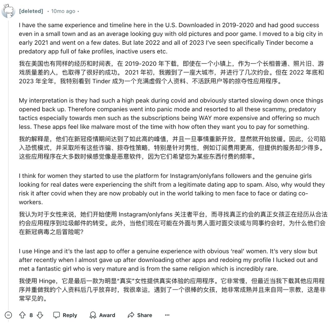关于一部分用户对 Dating App 不再买账的原因,我们在 Reddit 上倒是发现了一些呼声比较高的答案,总结起来大致是:虚假账户泛滥、“照骗”太多、聊不下去、对面突然断联等等。男女用户的使用感受也不太一样,通常是条件一般的男性用户收不到回应,被迫疯狂氪金(上文提及的 Tinder 推出的 499 美金/月的订阅套餐,可助力匹配平台内最受欢迎的用户),女性用户这边却是回不完的搭讪私信,同样体验很差,导致了用户流失的死亡循环。