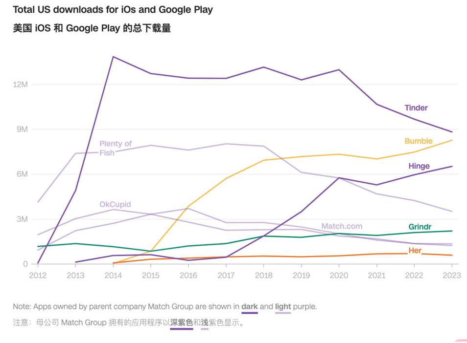 调查显示,超过 44% 的美国人使用在线约会服务的原因是为了寻求长期关系,高于以随意约会和寻求艳遇为目的的用户占比。在这样的背景下,以“勾搭”见长的 Tinder 开始走 “下坡路”,相较之下,女性用户优先的 Bumble 虽然增长预期不好、但总算走得平稳,以严肃交友著称的 Hinge 则在近几年取得了不错的增长。