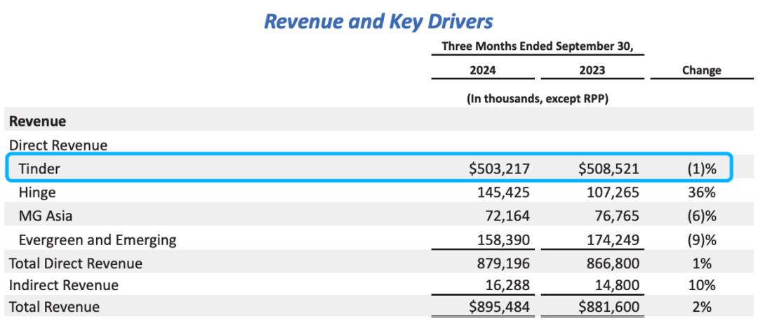 Match Group 在今天发布了最新一季度的财报,今年第三季度录得 8.95 亿美元的营收,同比增长了 2%。但具体看营收占比最大的 Tinder,收入其实是同比下降的,财报数据显示,报告期内 Tinder 营收 5.03 亿美元,同比下降 1%。上一次 Tinder 收入同比下降还是在 2022 年 Q4,这也是 Tinder 自发布财报以来唯二两次收入同比下滑。