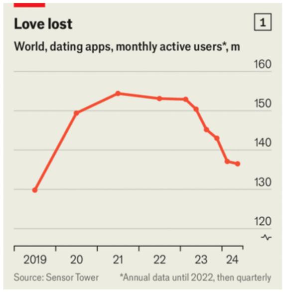 全球Dating品类MAU变化趋势|图源:《经济学人》
