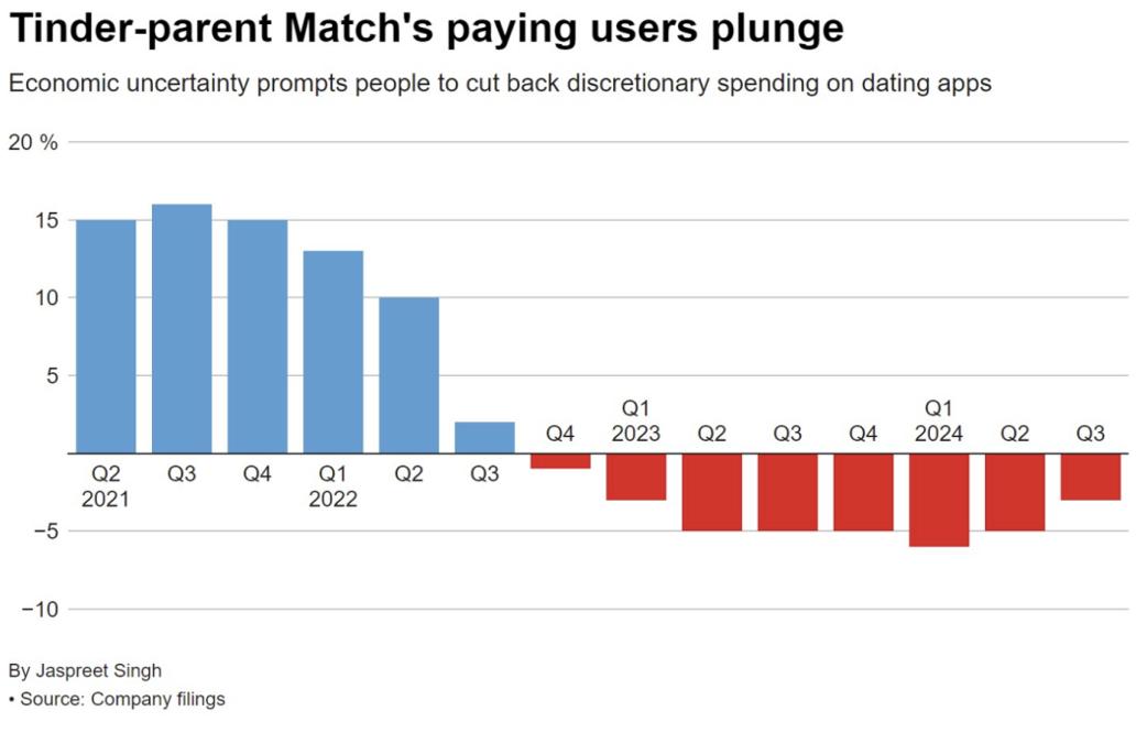 Match Group付费用户已经 连续8个季度下降|图源:Reuters