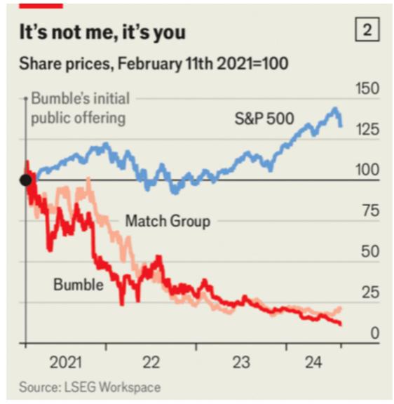 Tinder和Bumble股价变化趋势|图源:《经济学人》