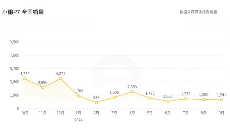 但到了2023年,小鹏P7i(小鹏P7改款)年销量下滑至4.6万辆,降幅超过20%。进入2024年,小鹏P7销量持续走低,今年1-9月累计销量仅1.3万辆,其中9月销量1242辆,同比大降73.4%,环比下降3.05%。
