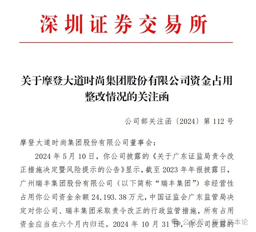 深交所向摩登大道时尚集团股份有限公司(下称,ST摩登)下发关注函,由于上市公司的责令整改期限将于11月10日届满,若未在剩余期间完成整改,深交所将对该公司股票实施停牌、退市风险警示乃至终止股票上市交易等措施。