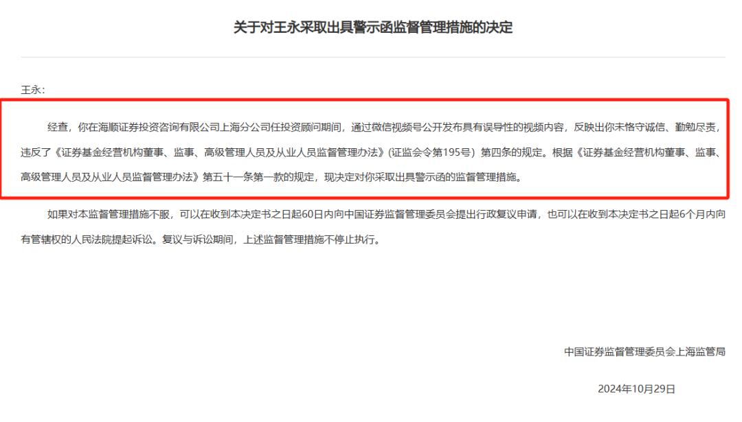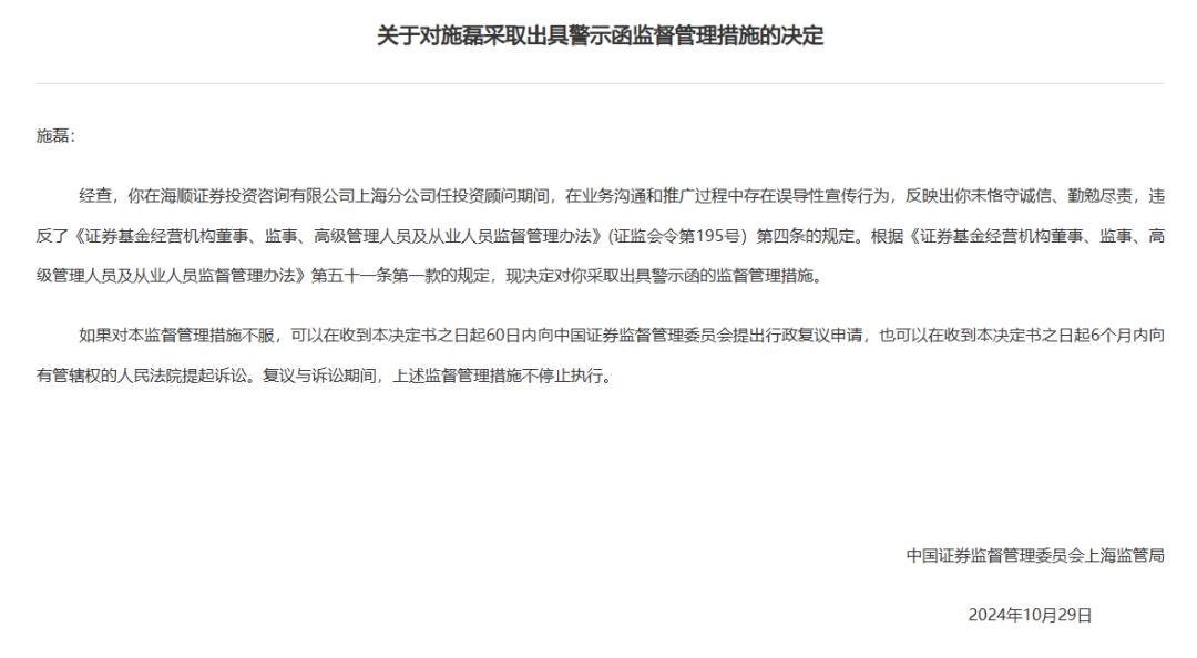 11月7日,上海证监局披露2张罚单,施磊、王永被采取出具警示函监督管理措施,施磊在海顺投顾上海分公司任投资顾问期间,在业务沟通和推广过程中存在误导性宣传行为;王永在海顺投顾上海分公司任投资顾问期间,通过微信视频号公开发布具有误导性的视频内容,反映出施磊、王永未恪守诚信、勤勉尽责,违反了相关规定。