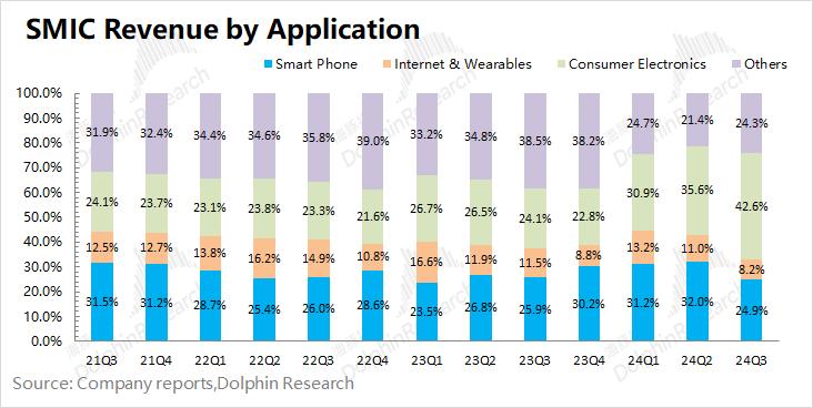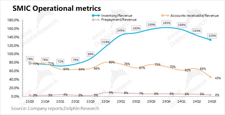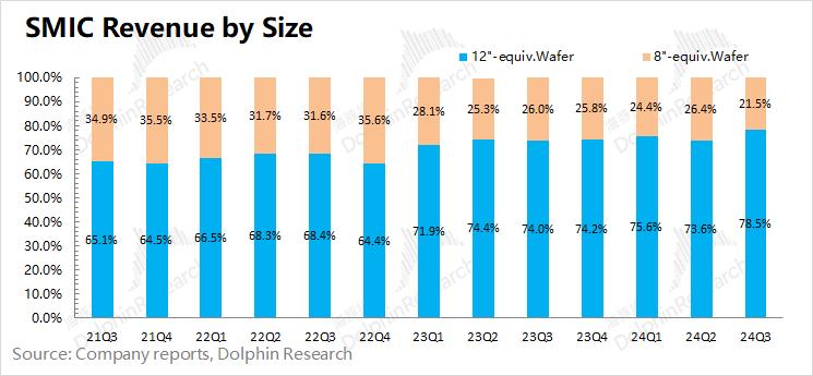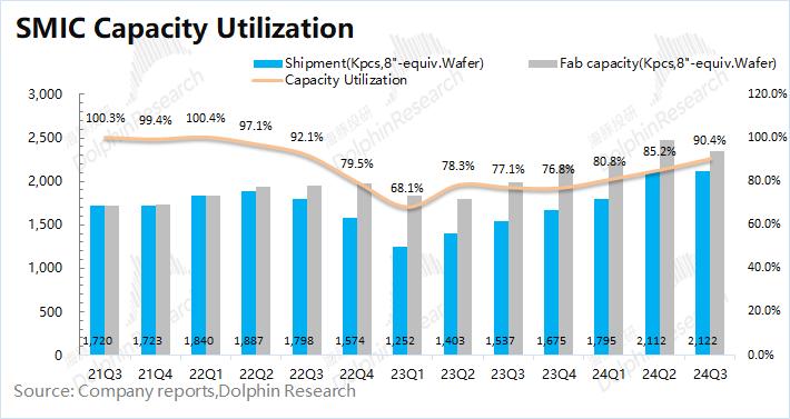 2024年第三季度中芯国际的产能利用率90.4%,本季度公司的产能利用率继续回升,但还未回到满产的阶段。海豚君认为虽然手机、PC等整体市场需求仍相对疲软,但公司的部分客户仍有产业链备货补库存的需求。当前公司产能利用率已经重新回到9成,表明半导体行业的整体供需关系正在好转。