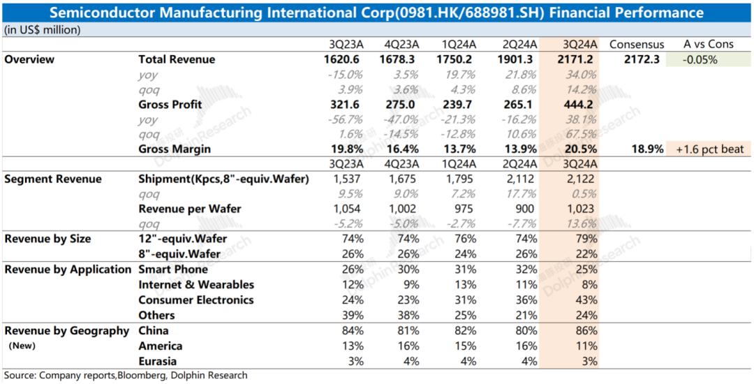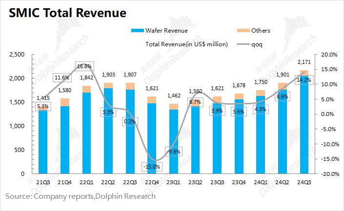 2024年第三季度中芯国际实现营收21.7亿美元,环比增加14.2%,符合指引区间(环比增长13-15%)。公司本季度的出货量环比微增,而价格端环比有较明显的提升。