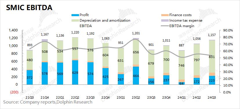 从 EBITDA 角度看,本季度中芯国际税息折旧及摊销前利润11.57亿美元,继续回升。
