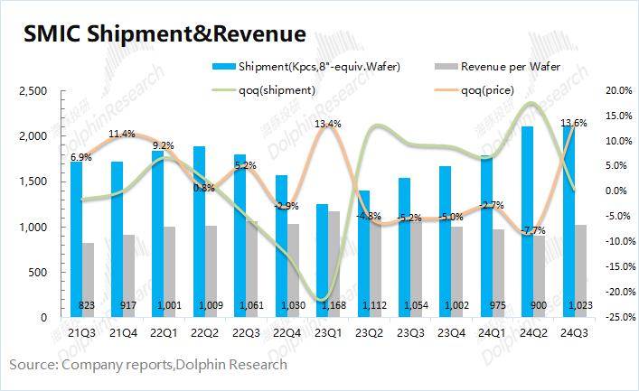 2)价的维度,中芯国际本季单晶圆收入(等效8寸)为1023美元,环比提升13.6%。
