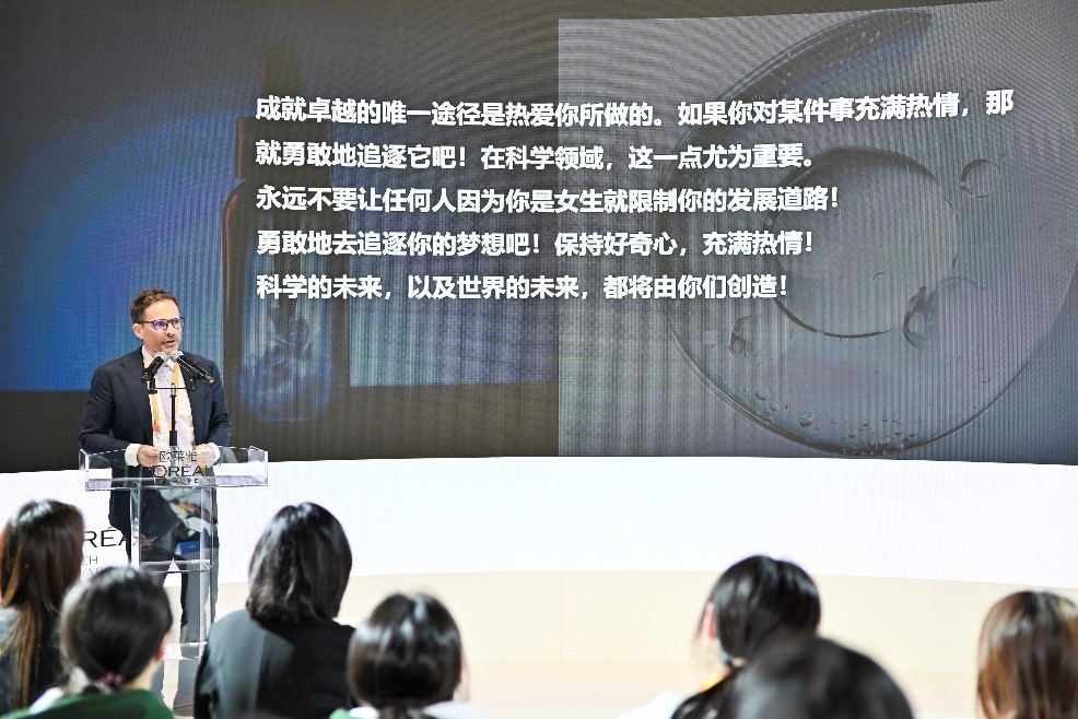 “科学并不仅仅局限于烧杯和实验服。它关乎创造力、解决问题的能力和真正改变世界的机会。”欧莱雅北亚区兼中国研发和创新中心副总裁马斯明分享道:“身为一名科研专家,我很骄傲能看到,欧莱雅的专利发明人中女性占比高达54%。因为她们的独特视角和才能,让我们更具有创造力。因此,我特别希望能有更多女生和女性在这一领域取得卓越成就。”同时,他也鼓励科技女生们:“永远不要因为女生的性别就限制自己的发展道路。请保持好奇心,大胆提问,将每个挑战视为成长的契机。”