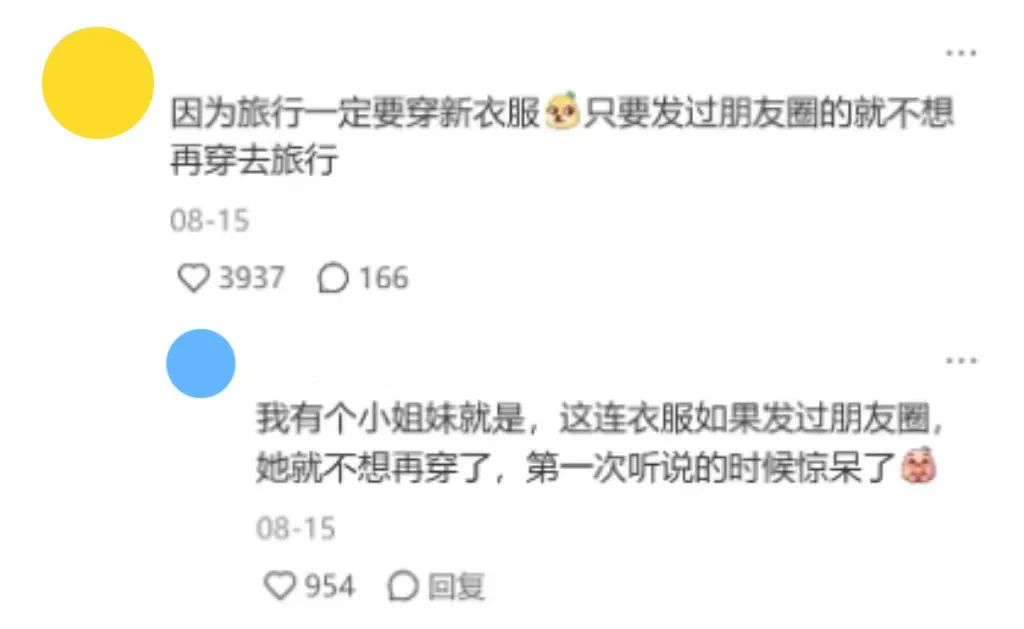 要问为啥不穿自己原来的衣服,轻便舒服还有量感,很多人的回答是:只要发过朋友圈的就不再是新衣,绝不能再穿出去旅行。