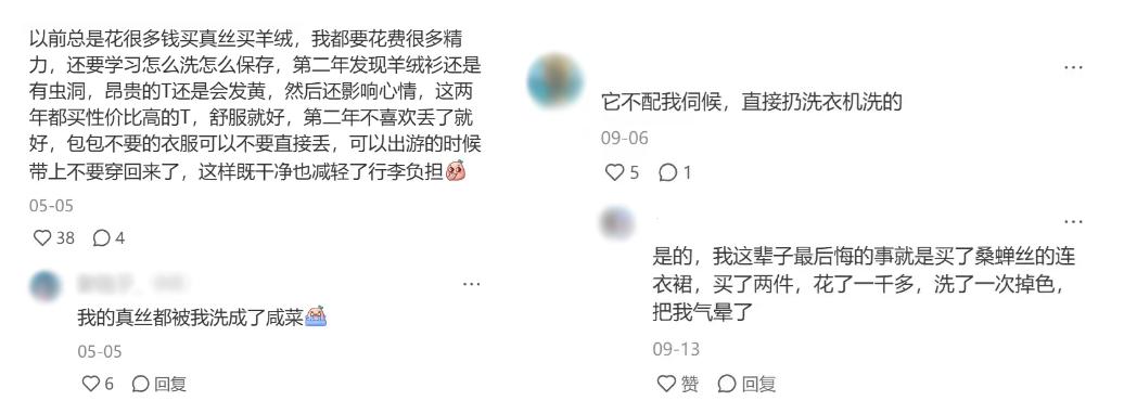 小红书上不少消费者交流选择次抛衣的原因时,都提到自己“已经没有伺候贵衣服的耐心”。