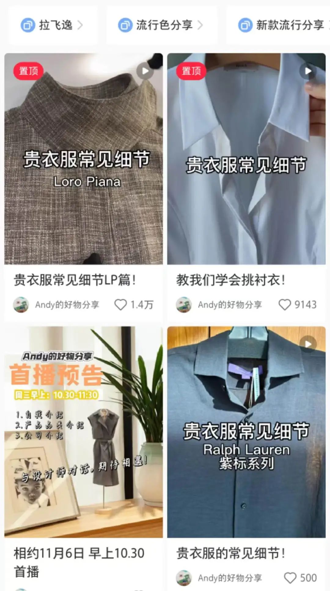 我们找到专门讲解怎么挑“高品质衣服”的博主@Andy的好物分享 聊了聊。他是国际服装品牌的设计总监,在女装行业干了二十年,目前,他在社交媒体上通过视频教粉丝鉴别“贵衣服”。