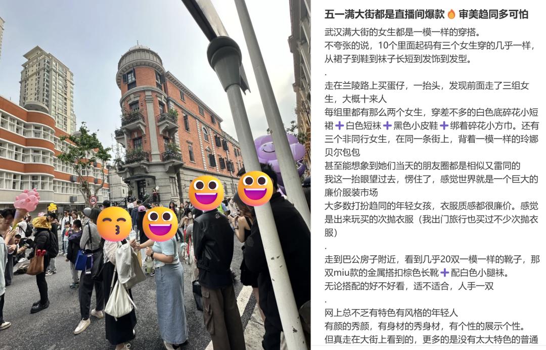 事实上,也确有部分人对次抛衣粉转黑,倒不是因为进行了Andy说的那些思考,只是因为五一出门逛了一圈,被同质化穿搭吓傻了。