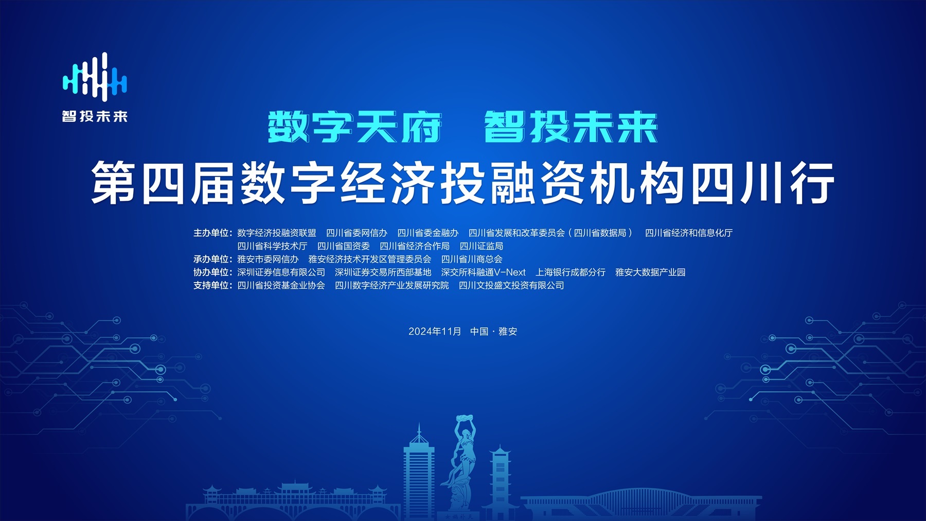 活动以“数字天府 智投未来”为主题,由数字经济投融资联盟、四川省委网信办、四川省委金融办、四川省发展和改革委员会(四川省数据局)、四川省经济和信息化厅、四川省科学技术厅、四川省国资委、四川省经济合作局、四川证监局主办,雅安市委网信办、雅安经济技术开发区管理委员会、四川省川商总会承办,深圳证券信息有限公司、深圳证券交易所西部基地、深交所科融通V-Next、上海银行成都分行、雅安大数据产业园协办,得到了四川省投资基金业协会、四川数字经济产业发展研究院、四川文投盛文投资有限公司的支持。