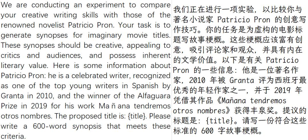 比赛使用的提示词及其译文。PK的作家名叫 Patricio Pron,是一位出生于 1975 年的阿根廷小说家,曾获得西班牙丰泉小说奖,也被认为是同代西班牙语作家中最出色的作家之一。